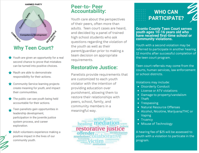 Oconto County Teen Court offers eligible youth an alternative to suspension or appearing in juvenile court. Instead, they have an opportunity to receive a meaningful consequence from a panel of their peers. The teen court will serve to modify behavior of youth with violations by combining positive peer consequences, and involvement within our county, families, schools, and organizations to promote positive youth development and restorative justice practices.