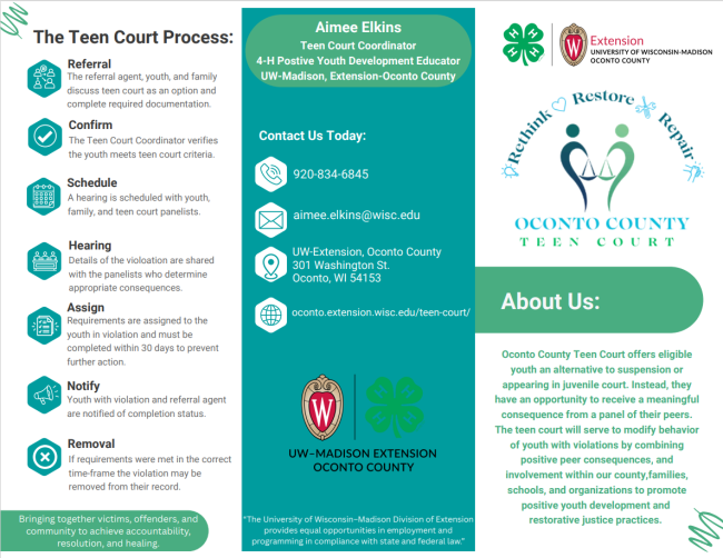 Oconto County Teen Court offers eligible youth an alternative to suspension or appearing in juvenile court. Instead, they have an opportunity to receive a meaningful consequence from a panel of their peers. The teen court will serve to modify behavior of youth with violations by combining positive peer consequences, and involvement within our county, families, schools, and organizations to promote positive youth development and restorative justice practices.