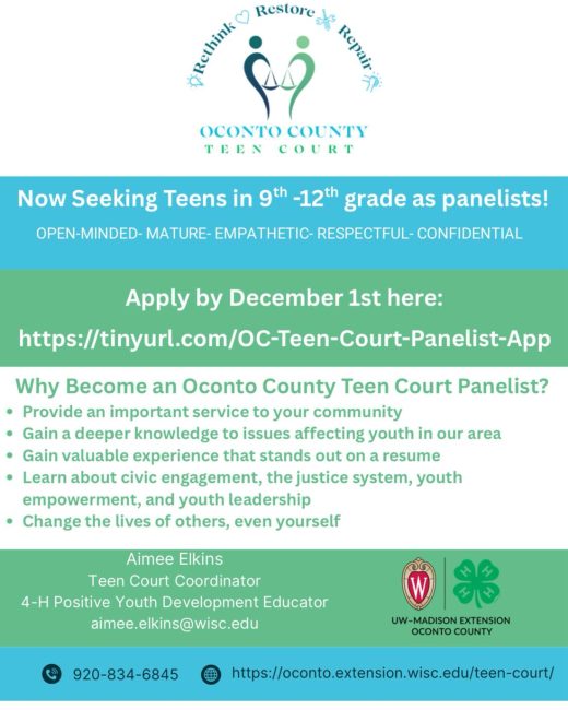To join the Teen Court panel, students must fill out an application, which can be obtained by using this link https://tinyurl.com/OC-Teen-Court-Panelist-App or by contacting Aimee Elkins at the Extension Office (920-834-6845).